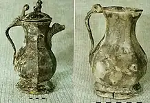 Deux mesures en étain de la fin du XIVe siècle ou du xve y étaient associées. En 2013, au cours de travaux à proximité de l'église, 4 autres mesures endommagées ont été retrouvées. Ce sont donc 6 mesures de cette période sur les trente-trois actuellement répertoriées en Europe qui ont été trouvées à La Ferté-Villeneuil. On a aussi recueilli au cours de ces travaux un chaudron en bronze, une enseigne religieuse (sportelle de Notre-Dame-de-Rocamadour) et une matrice de sceau.