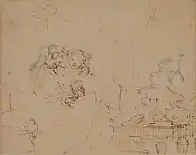 Une esquisse, propriété privée américaine, est considérée comme une étude préliminaire. Elle montre un couple où la femme est assise sur les genoux de l'homme, avec une plante sur une balustrade en arrière-plan et un arrière-plan architectural tout aussi différent. Une radiographie montre que Rembrandt avait à l'origine l'intention de faire asseoir la femme sur les genoux de l'homme également dans le tableau. Le croquis montre le visage d'un homme à droite, qui regarde les deux, un détail qui manque au tableau. Cet homme donne aux historiens de l'art l'impression que le croquis et la peinture représentent l'Isaac biblique et sa femme Rebecca[9]. Ce couple, selon le livre de la Genèse, est contraint par une famine de fuir vers le pays des Philistins du prince Abimelech. Comme Isaac a peur d'être tué par des hommes qui visent sa femme, il se fait passer pour son frère. Abimelech se moque du couple surpris dans une pose intime, mais ils ne sont pas punis, seulement réprimandés. Les philistins reçoivent alors l'ordre de laisser Isaac et Rebecca seuls.