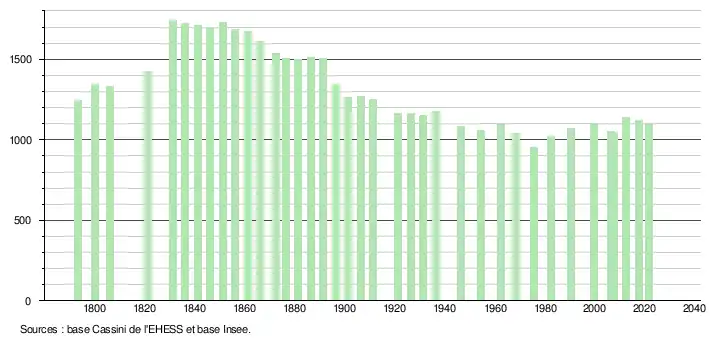 L'évolution du nombre d'habitants est connue à travers les recensements de la population effectués dans la commune depuis 1793. Pour les communes de moins de 10 000 habitants, une enquête de recensement portant sur toute la population est réalisée tous les cinq ans, les populations légales des années intermédiaires étant quant à elles estimées par interpolation ou extrapolation[21]. Pour la commune, le premier recensement exhaustif entrant dans le cadre du nouveau dispositif a été réalisé en 2007[22].