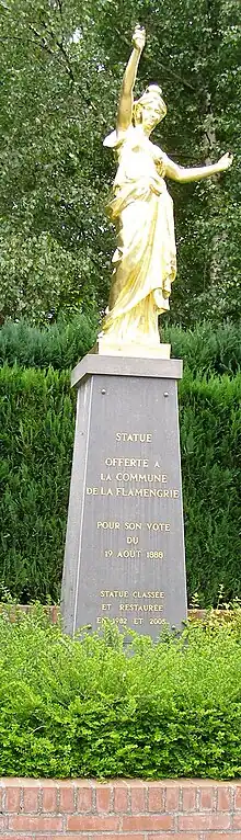 - La statue de Marianne (1889), don de la République reconnaissante pour le vote du refus du boulangisme, . La statue, haute d'environ 1,80 m dorée à la feuille, a été volée en 2008[17]. Une petite réplique en terre cuite est placée dans la mairie en en attendant la création d'une nouvelle statue grandeur originale[18].