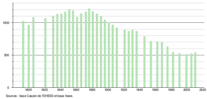- Dans le tableau des recensements et le graphique, par convention dans Wikipédia, le principe a été retenu, pour les populations légales postérieures à 1999 de n’afficher dans le tableau des recensements et le graphique que les populations correspondant à l'année 2006, première population légale publiée calculée conformément aux concepts définis dans le décret no 2003-485 du 5 juin 2003, et les années correspondant à une enquête exhaustive de recensement pour les communes de moins de 10 000 habitants, ainsi que la dernière population légale publiée par l’Insee.