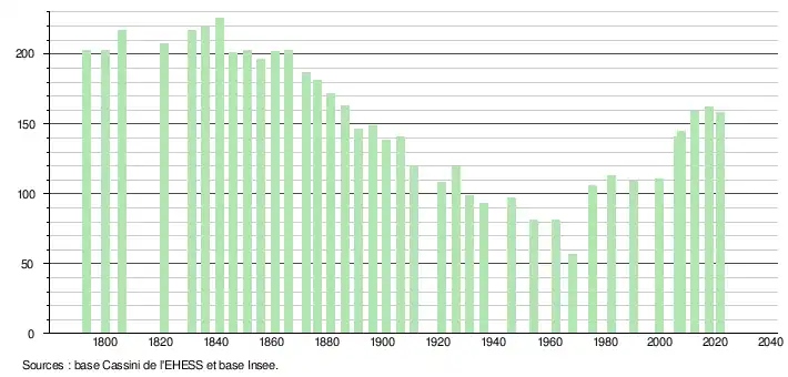 L'évolution du nombre d'habitants est connue à travers les recensements de la population effectués dans la commune depuis 1793. Pour les communes de moins de 10 000 habitants, une enquête de recensement portant sur toute la population est réalisée tous les cinq ans, les populations légales des années intermédiaires étant quant à elles estimées par interpolation ou extrapolation[48]. Pour la commune, le premier recensement exhaustif entrant dans le cadre du nouveau dispositif a été réalisé en 2007[49].