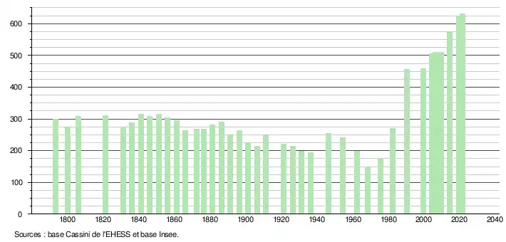 L'évolution du nombre d'habitants est connue à travers les recensements de la population effectués dans la commune depuis 1793. Pour les communes de moins de 10 000 habitants, une enquête de recensement portant sur toute la population est réalisée tous les cinq ans, les populations légales des années intermédiaires étant quant à elles estimées par interpolation ou extrapolation[21]. Pour la commune, le premier recensement exhaustif entrant dans le cadre du nouveau dispositif a été réalisé en 2004[22].