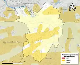 Le retrait-gonflement des sols argileux est susceptible d'engendrer des dommages importants aux bâtiments en cas d’alternance de périodes de sécheresse et de pluie. 39,4 % de la superficie communale est en aléa moyen ou fort (33,6 % au niveau départemental et 48,5 % au niveau national). Sur les 135 bâtiments dénombrés sur la commune en 2019, 28 sont en aléa moyen ou fort, soit 21 %, à comparer aux 25 % au niveau départemental et 54 % au niveau national. Une cartographie de l'exposition du territoire national au retrait gonflement des sols argileux est disponible sur le site du BRGM[22],[Carte 2].