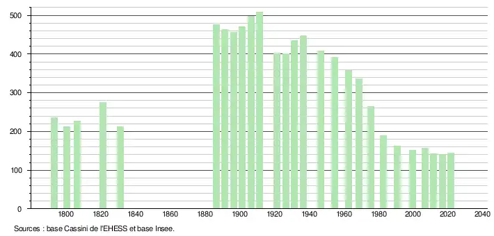 L'évolution du nombre d'habitants est connue à travers les recensements de la population effectués dans la commune depuis 1793. Pour les communes de moins de 10 000 habitants, une enquête de recensement portant sur toute la population est réalisée tous les cinq ans, les populations légales des années intermédiaires étant quant à elles estimées par interpolation ou extrapolation[38]. Pour la commune, le premier recensement exhaustif entrant dans le cadre du nouveau dispositif a été réalisé en 2006[39].