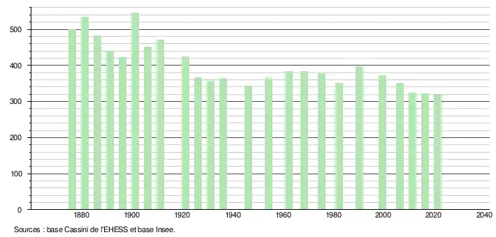 L'évolution du nombre d'habitants est connue à travers les recensements de la population effectués dans la commune depuis 1876. Pour les communes de moins de 10 000 habitants, une enquête de recensement portant sur toute la population est réalisée tous les cinq ans, les populations légales des années intermédiaires étant quant à elles estimées par interpolation ou extrapolation[18]. Pour la commune, le premier recensement exhaustif entrant dans le cadre du nouveau dispositif a été réalisé en 2006[19].