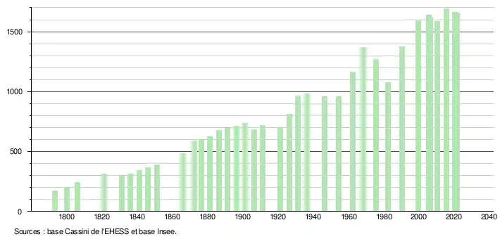 L'évolution du nombre d'habitants est connue à travers les recensements de la population effectués dans la commune depuis 1793. Pour les communes de moins de 10 000 habitants, une enquête de recensement portant sur toute la population est réalisée tous les cinq ans, les populations légales des années intermédiaires étant quant à elles estimées par interpolation ou extrapolation[26]. Pour la commune, le premier recensement exhaustif entrant dans le cadre du nouveau dispositif a été réalisé en 2005[27].