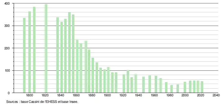 L'évolution du nombre d'habitants est connue à travers les recensements de la population effectués dans la commune depuis 1793. Pour les communes de moins de 10 000 habitants, une enquête de recensement portant sur toute la population est réalisée tous les cinq ans, les populations légales des années intermédiaires étant quant à elles estimées par interpolation ou extrapolation[22]. Pour la commune, le premier recensement exhaustif entrant dans le cadre du nouveau dispositif a été réalisé en 2006[23].