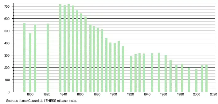 L'évolution du nombre d'habitants est connue à travers les recensements de la population effectués dans la commune depuis 1793. À partir du , les populations légales des communes sont publiées annuellement dans le cadre d'un recensement qui repose désormais sur une collecte d'information annuelle, concernant successivement tous les territoires communaux au cours d'une période de cinq ans. Pour les communes de moins de 10 000 habitants, une enquête de recensement portant sur toute la population est réalisée tous les cinq ans, les populations légales des années intermédiaires étant quant à elles estimées par interpolation ou extrapolation[7]. Pour la commune, le premier recensement exhaustif entrant dans le cadre du nouveau dispositif a été réalisé en 2006[8],[Note 2].