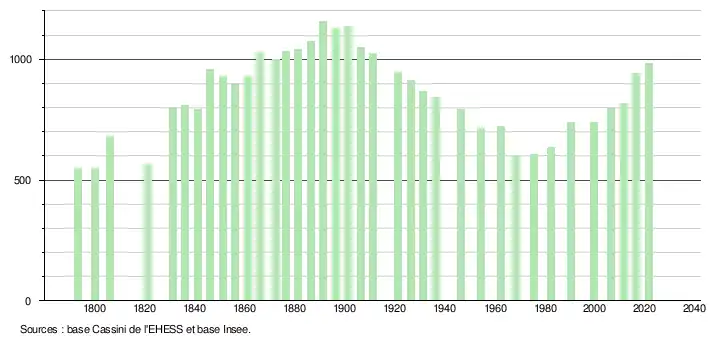 En 2021, la commune comptait 984 habitants[Note 4], en augmentation de 8,25 % par rapport à 2015 (Haute-Vienne : −1,09 %, France hors Mayotte : +1,84 %).