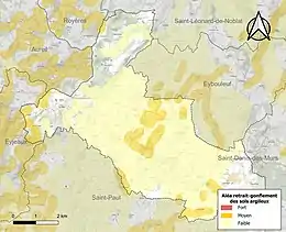 Le retrait-gonflement des sols argileux est susceptible d'engendrer des dommages importants aux bâtiments en cas d’alternance de périodes de sécheresse et de pluie[18]. 14,3 % de la superficie communale est en aléa moyen ou fort (27 % au niveau départemental et 48,5 % au niveau national métropolitain)[Carte 2]. Depuis le , en application de la loi ÉLAN, différentes contraintes s'imposent aux vendeurs, maîtres d'ouvrages ou constructeurs de biens situés dans une zone classée en aléa moyen ou fort[Note 3],[19].