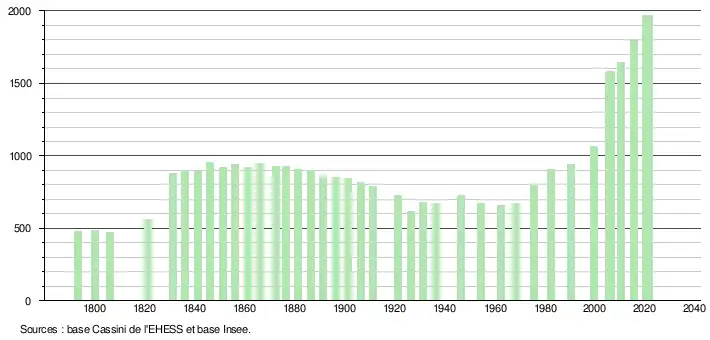 L'évolution du nombre d'habitants est connue à travers les recensements de la population effectués dans la commune depuis 1793. Pour les communes de moins de 10 000 habitants, une enquête de recensement portant sur toute la population est réalisée tous les cinq ans, les populations légales des années intermédiaires étant quant à elles estimées par interpolation ou extrapolation[22]. Pour la commune, le premier recensement exhaustif entrant dans le cadre du nouveau dispositif a été réalisé en 2005[23].