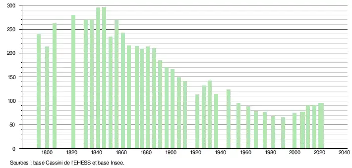 L'évolution du nombre d'habitants est connue à travers les recensements de la population effectués dans la commune depuis 1793. Pour les communes de moins de 10 000 habitants, une enquête de recensement portant sur toute la population est réalisée tous les cinq ans, les populations légales des années intermédiaires étant quant à elles estimées par interpolation ou extrapolation[17]. Pour la commune, le premier recensement exhaustif entrant dans le cadre du nouveau dispositif a été réalisé en 2005[18].