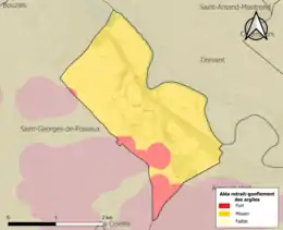 La commune est vulnérable au risque de mouvements de terrains constitué principalement du retrait-gonflement des sols argileux[16]. Cet aléa est susceptible d'engendrer des dommages importants aux bâtiments en cas d’alternance de périodes de sécheresse et de pluie. La totalité de la commune est en aléa moyen ou fort (90 % au niveau départemental et 48,5 % au niveau national). Sur les 70 bâtiments dénombrés sur la commune en 2019, 70 sont en aléa moyen ou fort, soit 100 %, à comparer aux 83 % au niveau départemental et 54 % au niveau national. Une cartographie de l'exposition du territoire national au retrait gonflement des sols argileux est disponible sur le site du BRGM[17],[Carte 2].