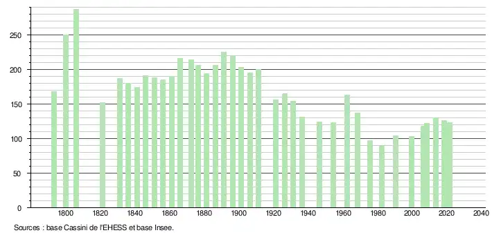 L'évolution du nombre d'habitants est connue à travers les recensements de la population effectués dans la commune depuis 1793. Pour les communes de moins de 10 000 habitants, une enquête de recensement portant sur toute la population est réalisée tous les cinq ans, les populations légales des années intermédiaires étant quant à elles estimées par interpolation ou extrapolation[25]. Pour la commune, le premier recensement exhaustif entrant dans le cadre du nouveau dispositif a été réalisé en 2008[26].