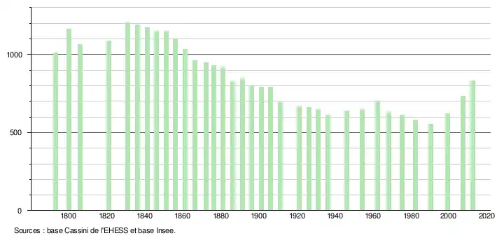 L'évolution du nombre d'habitants est connue à travers les recensements de la population effectués dans la commune depuis 1793. À partir du , les populations légales des communes sont publiées annuellement dans le cadre d'un recensement qui repose désormais sur une collecte d'information annuelle, concernant successivement tous les territoires communaux au cours d'une période de cinq ans. Pour les communes de moins de 10 000 habitants, une enquête de recensement portant sur toute la population est réalisée tous les cinq ans, les populations légales des années intermédiaires étant quant à elles estimées par interpolation ou extrapolation[3]. Pour la commune, le premier recensement exhaustif entrant dans le cadre du nouveau dispositif a été réalisé en 2007[4],[Note 1].
