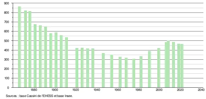 L'évolution du nombre d'habitants est connue à travers les recensements de la population effectués dans la commune depuis 1866. Pour les communes de moins de 10 000 habitants, une enquête de recensement portant sur toute la population est réalisée tous les cinq ans, les populations légales des années intermédiaires étant quant à elles estimées par interpolation ou extrapolation[21]. Pour la commune, le premier recensement exhaustif entrant dans le cadre du nouveau dispositif a été réalisé en 2008[22].