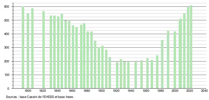L'évolution du nombre d'habitants est connue à travers les recensements de la population effectués dans la commune depuis 1793. Pour les communes de moins de 10 000 habitants, une enquête de recensement portant sur toute la population est réalisée tous les cinq ans, les populations légales des années intermédiaires étant quant à elles estimées par interpolation ou extrapolation[21]. Pour la commune, le premier recensement exhaustif entrant dans le cadre du nouveau dispositif a été réalisé en 2007[22].