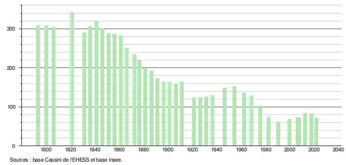 L'évolution du nombre d'habitants est connue à travers les recensements de la population effectués dans la commune depuis 1793. Pour les communes de moins de 10 000 habitants, une enquête de recensement portant sur toute la population est réalisée tous les cinq ans, les populations légales des années intermédiaires étant quant à elles estimées par interpolation ou extrapolation[30]. Pour la commune, le premier recensement exhaustif entrant dans le cadre du nouveau dispositif a été réalisé en 2007[31].