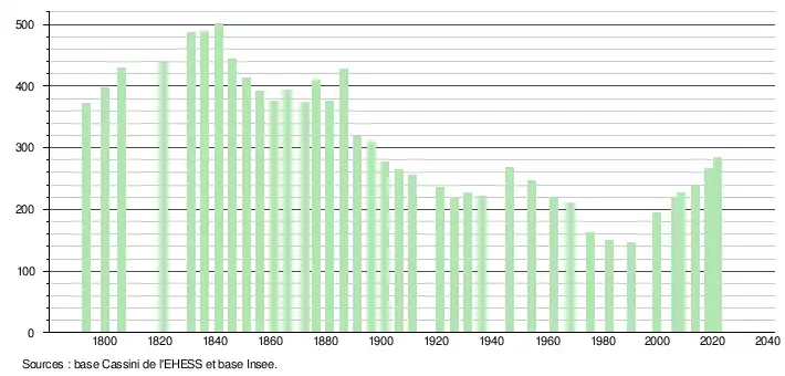 L'évolution du nombre d'habitants est connue à travers les recensements de la population effectués dans la commune depuis 1793. Pour les communes de moins de 10 000 habitants, une enquête de recensement portant sur toute la population est réalisée tous les cinq ans, les populations légales des années intermédiaires étant quant à elles estimées par interpolation ou extrapolation[25]. Pour la commune, le premier recensement exhaustif entrant dans le cadre du nouveau dispositif a été réalisé en 2008[26].