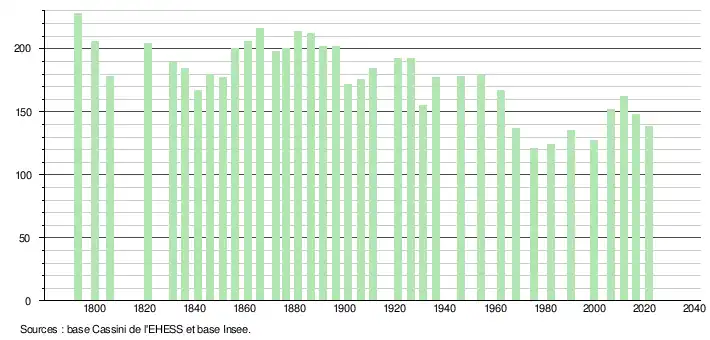 L'évolution du nombre d'habitants est connue à travers les recensements de la population effectués dans la commune depuis 1793. Pour les communes de moins de 10 000 habitants, une enquête de recensement portant sur toute la population est réalisée tous les cinq ans, les populations légales des années intermédiaires étant quant à elles estimées par interpolation ou extrapolation[22]. Pour la commune, le premier recensement exhaustif entrant dans le cadre du nouveau dispositif a été réalisé en 2006[23].