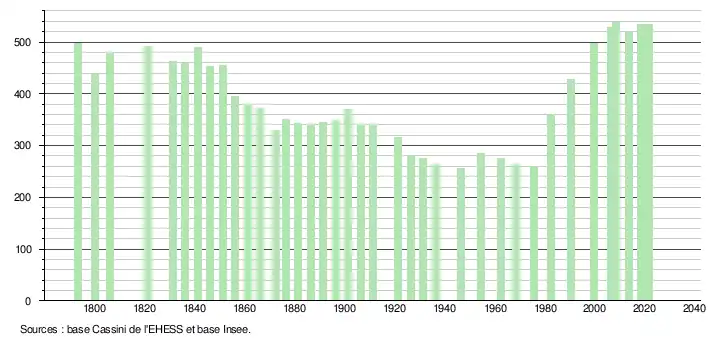 L'évolution du nombre d'habitants est connue à travers les recensements de la population effectués dans la commune depuis 1793. Pour les communes de moins de 10 000 habitants, une enquête de recensement portant sur toute la population est réalisée tous les cinq ans, les populations légales des années intermédiaires étant quant à elles estimées par interpolation ou extrapolation[16]. Pour la commune, le premier recensement exhaustif entrant dans le cadre du nouveau dispositif a été réalisé en 2008[17].