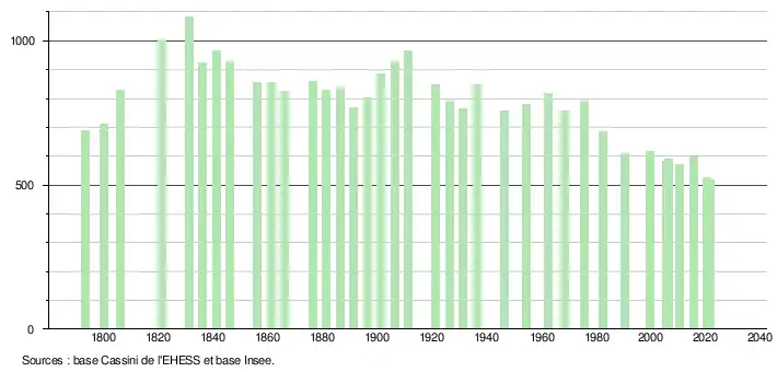 L'évolution du nombre d'habitants est connue à travers les recensements de la population effectués dans la commune depuis 1793. Pour les communes de moins de 10 000 habitants, une enquête de recensement portant sur toute la population est réalisée tous les cinq ans, les populations légales des années intermédiaires étant quant à elles estimées par interpolation ou extrapolation[19]. Pour la commune, le premier recensement exhaustif entrant dans le cadre du nouveau dispositif a été réalisé en 2005[20].