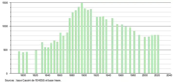 L'évolution du nombre d'habitants est connue à travers les recensements de la population effectués dans la commune depuis 1793. Pour les communes de moins de 10 000 habitants, une enquête de recensement portant sur toute la population est réalisée tous les cinq ans, les populations légales des années intermédiaires étant quant à elles estimées par interpolation ou extrapolation[15]. Pour la commune, le premier recensement exhaustif entrant dans le cadre du nouveau dispositif a été réalisé en 2006[16].