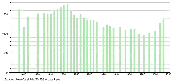 L'évolution du nombre d'habitants est connue à travers les recensements de la population effectués dans la commune depuis 1793. À partir du , les populations légales des communes sont publiées annuellement dans le cadre d'un recensement qui repose désormais sur une collecte d'information annuelle, concernant successivement tous les territoires communaux au cours d'une période de cinq ans. Pour les communes de moins de 10 000 habitants, une enquête de recensement portant sur toute la population est réalisée tous les cinq ans, les populations légales des années intermédiaires étant quant à elles estimées par interpolation ou extrapolation[11]. Pour la commune, le premier recensement exhaustif entrant dans le cadre du nouveau dispositif a été réalisé en 2007[12],[Note 1].