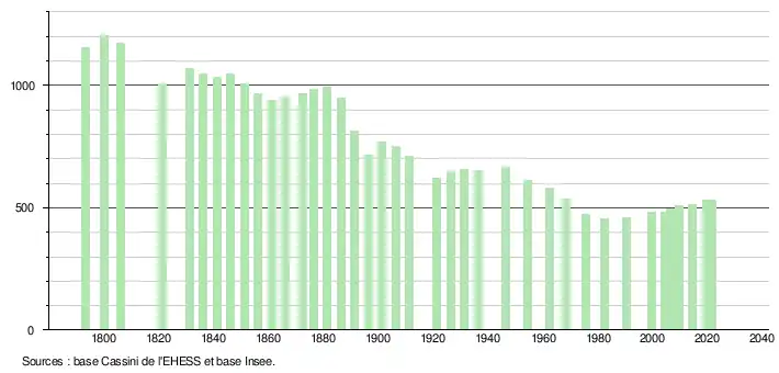 L'évolution du nombre d'habitants est connue à travers les recensements de la population effectués dans la commune depuis 1793. Pour les communes de moins de 10 000 habitants, une enquête de recensement portant sur toute la population est réalisée tous les cinq ans, les populations légales des années intermédiaires étant quant à elles estimées par interpolation ou extrapolation[23]. Pour la commune, le premier recensement exhaustif entrant dans le cadre du nouveau dispositif a été réalisé en 2004[24].