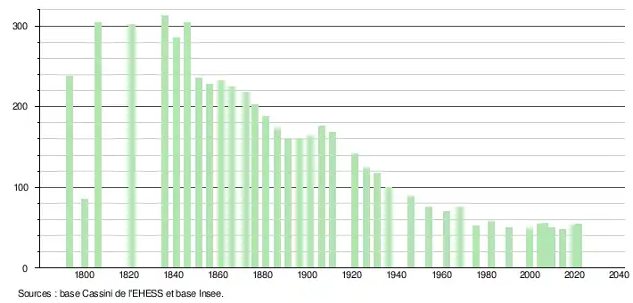 L'évolution du nombre d'habitants est connue à travers les recensements de la population effectués dans la commune depuis 1793. Pour les communes de moins de 10 000 habitants, une enquête de recensement portant sur toute la population est réalisée tous les cinq ans, les populations légales des années intermédiaires étant quant à elles estimées par interpolation ou extrapolation[19]. Pour la commune, le premier recensement exhaustif entrant dans le cadre du nouveau dispositif a été réalisé en 2004[20].