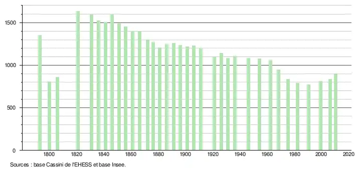 L'évolution du nombre d'habitants est connue à travers les recensements de la population effectués dans la commune depuis 1793. À partir du , les populations légales des communes sont publiées annuellement dans le cadre d'un recensement qui repose désormais sur une collecte d'information annuelle, concernant successivement tous les territoires communaux au cours d'une période de cinq ans. Pour les communes de moins de 10 000 habitants, une enquête de recensement portant sur toute la population est réalisée tous les cinq ans, les populations légales des années intermédiaires étant quant à elles estimées par interpolation ou extrapolation[8]. Pour la commune, le premier recensement exhaustif entrant dans le cadre du nouveau dispositif a été réalisé en 2005[9],[Note 1].