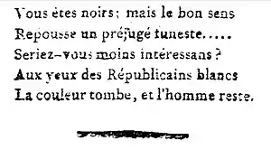 La même année, une autre chanson abolitionniste française paraît, traitant d'un thème similaire et nommée Couplets sur la liberté des nègres, par Royer[11].