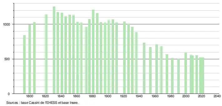 L'évolution du nombre d'habitants est connue à travers les recensements de la population effectués dans la commune depuis 1793. Pour les communes de moins de 10 000 habitants, une enquête de recensement portant sur toute la population est réalisée tous les cinq ans, les populations légales des années intermédiaires étant quant à elles estimées par interpolation ou extrapolation[41]. Pour la commune, le premier recensement exhaustif entrant dans le cadre du nouveau dispositif a été réalisé en 2008[42].