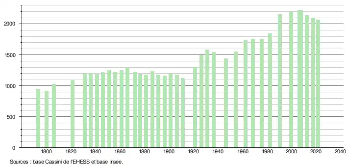 L'évolution du nombre d'habitants est connue à travers les recensements de la population effectués dans la commune depuis 1793. Pour les communes de moins de 10 000 habitants, une enquête de recensement portant sur toute la population est réalisée tous les cinq ans, les populations légales des années intermédiaires étant quant à elles estimées par interpolation ou extrapolation[28]. Pour la commune, le premier recensement exhaustif entrant dans le cadre du nouveau dispositif a été réalisé en 2007[29].