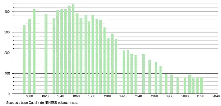 L'évolution du nombre d'habitants est connue à travers les recensements de la population effectués dans la commune depuis 1793. Pour les communes de moins de 10 000 habitants, une enquête de recensement portant sur toute la population est réalisée tous les cinq ans, les populations légales des années intermédiaires étant quant à elles estimées par interpolation ou extrapolation[27]. Pour la commune, le premier recensement exhaustif entrant dans le cadre du nouveau dispositif a été réalisé en 2005[28].