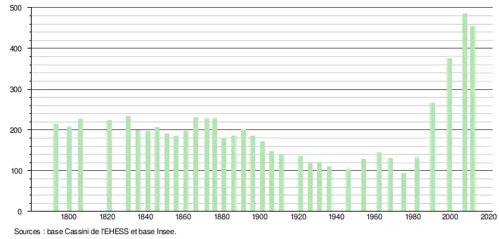 L'évolution du nombre d'habitants est connue à travers les recensements de la population effectués dans la commune depuis 1793. À partir du , les populations légales des communes sont publiées annuellement dans le cadre d'un recensement qui repose désormais sur une collecte d'information annuelle, concernant successivement tous les territoires communaux au cours d'une période de cinq ans. Pour les communes de moins de 10 000 habitants, une enquête de recensement portant sur toute la population est réalisée tous les cinq ans, les populations légales des années intermédiaires étant quant à elles estimées par interpolation ou extrapolation[3]. Pour la commune, le premier recensement exhaustif entrant dans le cadre du nouveau dispositif a été réalisé en 2007[4],[Note 1].