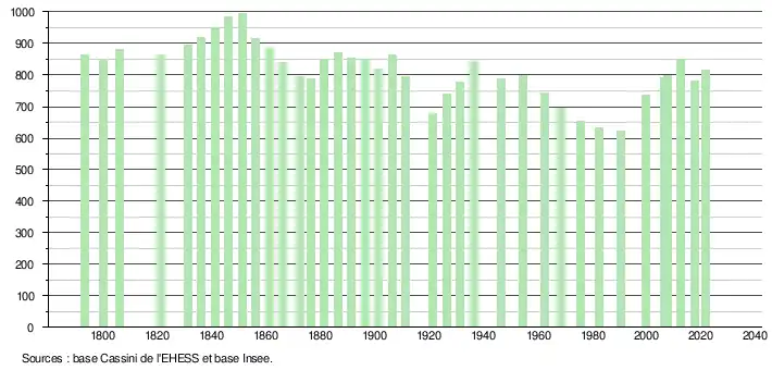 L'évolution du nombre d'habitants est connue à travers les recensements de la population effectués dans la commune depuis 1793. Pour les communes de moins de 10 000 habitants, une enquête de recensement portant sur toute la population est réalisée tous les cinq ans, les populations légales des années intermédiaires étant quant à elles estimées par interpolation ou extrapolation[31]. Pour la commune, le premier recensement exhaustif entrant dans le cadre du nouveau dispositif a été réalisé en 2007[32].