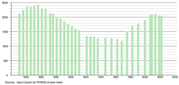 L'évolution du nombre d'habitants est connue à travers les recensements de la population effectués dans la commune depuis 1831. Pour les communes de moins de 10 000 habitants, une enquête de recensement portant sur toute la population est réalisée tous les cinq ans, les populations légales des années intermédiaires étant quant à elles estimées par interpolation ou extrapolation[26]. Pour la commune, le premier recensement exhaustif entrant dans le cadre du nouveau dispositif a été réalisé en 2008[27].