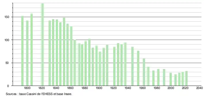 L'évolution du nombre d'habitants est connue à travers les recensements de la population effectués dans la commune depuis 1793. Pour les communes de moins de 10 000 habitants, une enquête de recensement portant sur toute la population est réalisée tous les cinq ans, les populations légales des années intermédiaires étant quant à elles estimées par interpolation ou extrapolation[62]. Pour la commune, le premier recensement exhaustif entrant dans le cadre du nouveau dispositif a été réalisé en 2006[63].