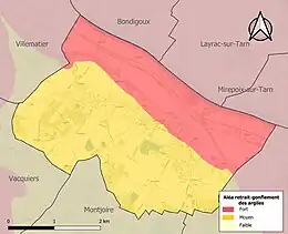 Le retrait-gonflement des sols argileux est susceptible d'engendrer des dommages importants aux bâtiments en cas d’alternance de périodes de sécheresse et de pluie. La totalité de la commune est en aléa moyen ou fort (88,8 % au niveau départemental et 48,5 % au niveau national). Sur les 421 bâtiments dénombrés sur la commune en 2019, 421 sont en aléa moyen ou fort, soit 100 %, à comparer aux 98 % au niveau départemental et 54 % au niveau national. Une cartographie de l'exposition du territoire national au retrait gonflement des sols argileux est disponible sur le site du BRGM[26],[Carte 3].