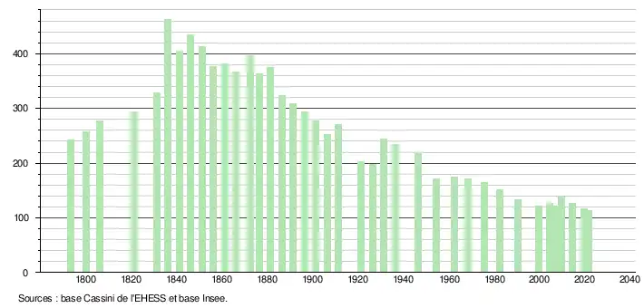 L'évolution du nombre d'habitants est connue à travers les recensements de la population effectués dans la commune depuis 1793. Pour les communes de moins de 10 000 habitants, une enquête de recensement portant sur toute la population est réalisée tous les cinq ans, les populations légales des années intermédiaires étant quant à elles estimées par interpolation ou extrapolation[15]. Pour la commune, le premier recensement exhaustif entrant dans le cadre du nouveau dispositif a été réalisé en 2004[16].