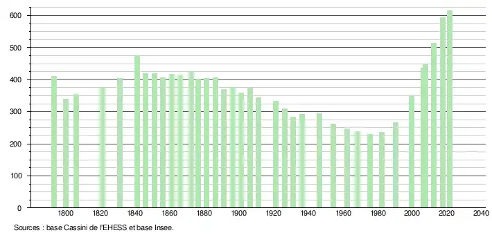 L'évolution du nombre d'habitants est connue à travers les recensements de la population effectués dans la commune depuis 1793. Pour les communes de moins de 10 000 habitants, une enquête de recensement portant sur toute la population est réalisée tous les cinq ans, les populations légales des années intermédiaires étant quant à elles estimées par interpolation ou extrapolation[18]. Pour la commune, le premier recensement exhaustif entrant dans le cadre du nouveau dispositif a été réalisé en 2007[19].