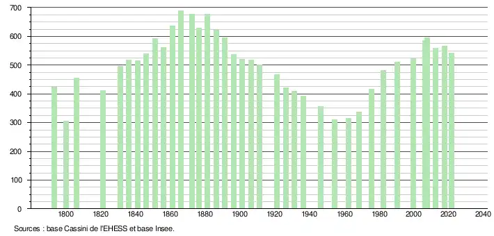 L'évolution du nombre d'habitants est connue à travers les recensements de la population effectués dans la commune depuis 1793. Pour les communes de moins de 10 000 habitants, une enquête de recensement portant sur toute la population est réalisée tous les cinq ans, les populations légales des années intermédiaires étant quant à elles estimées par interpolation ou extrapolation[17]. Pour la commune, le premier recensement exhaustif entrant dans le cadre du nouveau dispositif a été réalisé en 2007[18].