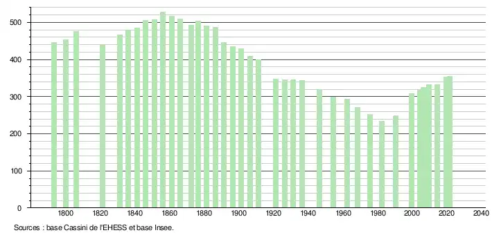 L'évolution du nombre d'habitants est connue à travers les recensements de la population effectués dans la commune depuis 1793. Pour les communes de moins de 10 000 habitants, une enquête de recensement portant sur toute la population est réalisée tous les cinq ans, les populations légales des années intermédiaires étant quant à elles estimées par interpolation ou extrapolation[16]. Pour la commune, le premier recensement exhaustif entrant dans le cadre du nouveau dispositif a été réalisé en 2004[17].