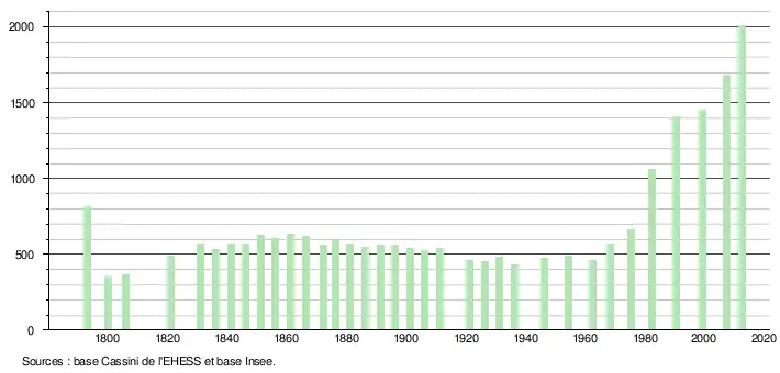 L'évolution du nombre d'habitants est connue à travers les recensements de la population effectués dans la commune depuis 1793. À partir du , les populations légales des communes sont publiées annuellement dans le cadre d'un recensement qui repose désormais sur une collecte d'information annuelle, concernant successivement tous les territoires communaux au cours d'une période de cinq ans. Pour les communes de moins de 10 000 habitants, une enquête de recensement portant sur toute la population est réalisée tous les cinq ans, les populations légales des années intermédiaires étant quant à elles estimées par interpolation ou extrapolation[19]. Pour la commune, le premier recensement exhaustif entrant dans le cadre du nouveau dispositif a été réalisé en 2007[20],[Note 1].