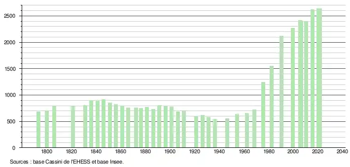 L'évolution du nombre d'habitants est connue à travers les recensements de la population effectués dans la commune depuis 1793. Pour les communes de moins de 10 000 habitants, une enquête de recensement portant sur toute la population est réalisée tous les cinq ans, les populations légales des années intermédiaires étant quant à elles estimées par interpolation ou extrapolation[29]. Pour la commune, le premier recensement exhaustif entrant dans le cadre du nouveau dispositif a été réalisé en 2005[30].