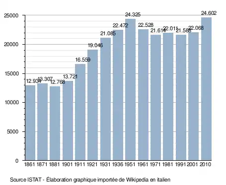 Selon les données de l’Institut national de statistique (ISTAT) au la population étrangère résidente et déclarée était de 3851 personnes, soit 15,7 % de la population résidente[6]. Les nationalités majoritairement représentées étaient :