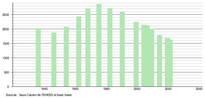 L'évolution du nombre d'habitants est connue à travers les recensements de la population effectués dans la commune depuis 1936. Pour les communes de moins de 10 000 habitants, une enquête de recensement portant sur toute la population est réalisée tous les cinq ans, les populations légales des années intermédiaires étant quant à elles estimées par interpolation ou extrapolation[31]. Pour la commune, le premier recensement exhaustif entrant dans le cadre du nouveau dispositif a été réalisé en 2004[32].
