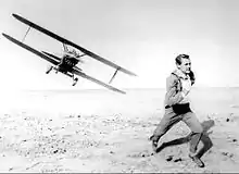 La Mort aux trousses contient quelques scènes d'anthologie, dont l'une des plus connues est celle où Thornhill (Cary Grant) pense avoir rendez-vous avec l'agent « fantôme » Kaplan en rase campagne. Au lieu de la rencontre qu'il prévoyait, il se retrouve être la proie d'un petit avion dont les occupants le mitraillent. La séquence entière constitue un condensé de l'art et du génie du réalisateur. Dans le scénario la séquence se déroule dans l'Indiana, en réalité elle fut tournée en Californie.